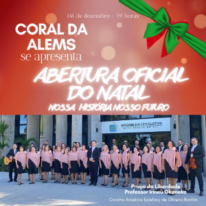 Cantata de Natal da ALEMS contempla músicas natalinas regionais em espetáculo Quinta-feira, 12 de Dezembro de 2024 | Escrito por Aline Kraemer Ao som do berrante, os coralistas da Assembleia Legislativa de Mato Grosso do Sul (ALEMS) mostraram que cantigas natalinas também podem ter o rasqueado, a sanfona e a viola que tocam a alma do sul-mato-grossense. Além dos instrumentos regionais, o maestro Nilo Cunha ainda conduziu uma orquestra que acompanhou vozes e a solista Alice Cunha. Entre tantos instrumentos como flauta, violino e violoncelo o coral também entoou músicas clássicas e… Quinta-feira, 12 de Dezembro de 2024 | Escrito por Aline Kraemer Leia + |